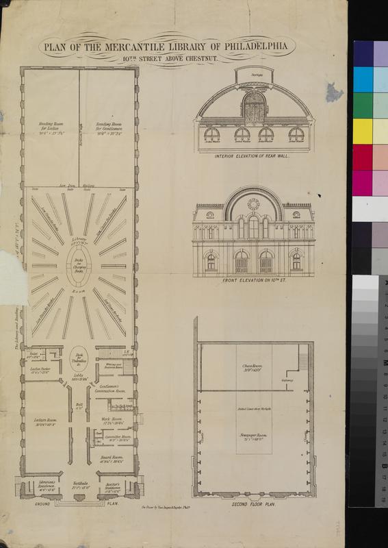 Plan for the library building originally built circa 1859 after the designs of John McArthur as a market house. Shows the ground and second floor plans including dimensions, "Front Elevation on 10th Street," and "Interior elevation of Rear Wall." Floor plans include reading rooms for ladies and gentlemen, library room containing "desks for changing books" and book cases, toilet, ladies parlor, desk for umbrellas, writing and business room, lecture room, gentleman's conversation room, work room, committee room, board room, librarian's and janitor's residences, chess room, and newspaper room. Interior elevation contains a sky light and stained glass window. The library, organized in 1821 for the benefit of merchants and merchant clerks, purchased the building in 1867 and relocated in 1869.