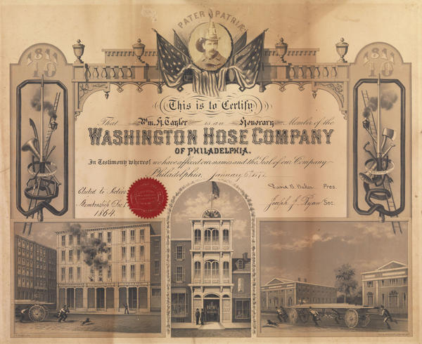 Fire company certificate containing vignettes depicting fire fighters arriving at a fire at J.F. [i.e. J.E.] Caldwell & Company's store at 902 Chestnut Street (burned January 14, 1869); the company fire station on Lombard Street, east of 11th Street; and fire fighters pulling a fire engine past University of Pennsylvania buildings on 9th Street. Fire fighting equipment including a fire hose, a ladder, an axe, a bullhorn and other tools are drawn bundled together to form decorative elements on both sides. A small oval photographic portrait of a fireman is pasted above the text.