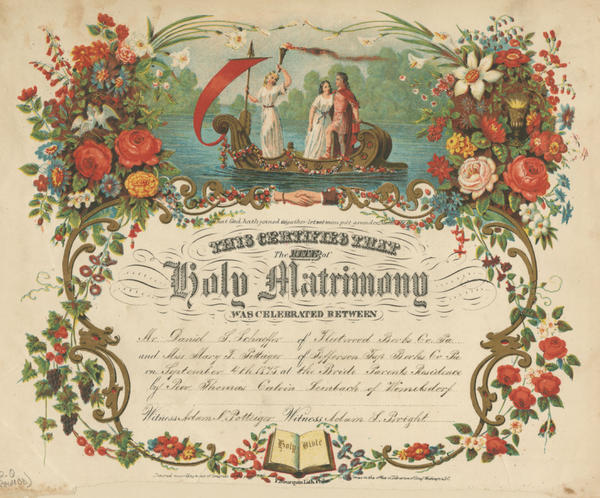 Marriage certificate illustrated with an ornate border containing a romantic scene. Scene shows a couple, accompanied by the female allegorical figure Love, sailing in a gondola. Love holds an arrow and torch and the gondola is adorned with a garland of flowers. Border also includes flowers, vinery, doves, the Bible, and clasped hands over the Biblical quote "What God hath joined together let not man put asunder, Matth. XIX.6."