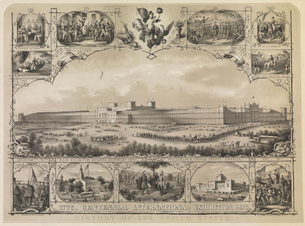 Print containing a central view of the proposed Main Exhibition Building surrounded by titled vignettes showing key events in the history of the United States. View includes trains of people arriving by foot, on horseback, and by omnibus in front of the exhibition hall. The length, width, and square footage of the building are printed below the image. Vignettes, predominately events from the American Revolution, War of 1812, Mexican American and Civil War, include "Drafting the Declaration of Independence - The Committee"; "Reading the Declaration of Independence"; Celebration of the Fourth of July After the [Civil] War"; "Battle at Manmouth"; "Entry into Mexico"; "Battle of Lake Erie"; the raising of the American flag at "Fort Sumter"; "Surrender of Lee"; and Lincoln's celebratory "Entry into Richmond." Many of the images include victorious military leaders in addition to celebratory crowds. Other vignette views show street and pedestrian traffic in front of "Independence Hall or State House, Phila." and "The Memorial Building or "Art Gallery," Phila." Also contains the figure of America; an American eagle; a bee hive icon for "Agriculture" and train icon for "Mechanics"; Native American figures incorporated into the border; and banners reading "Great World Fair" and "Industry of All Nations." The fair celebrated the centennial of the United States through an international exhibition of industry, agriculture, and art in West Farimount Park.