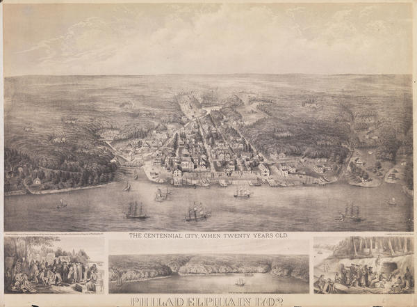 Print containing a panoramic view of the city in 1702 and three titled vignette views representing the early settlement of the city. View looks west from Camden, New Jersey and shows the Delaware River and burgeoning Philadelphia cityscape. Includes Swedes Church (1); Old Horse Mill (2); Pont House from Chester (3); Sven Svener's House (4); Duck Pond and Indian Huts at 3rd & Pine (5), Loxley's House (6); Dock Creek and drawbridge (9); Blue Anchor Tavern (13); Budd's Row (18); Carpenter's House, Brewery and Bakery (20); Old Slate House (22); Friends Public School (24); Benezet House (25); Duck Pond at 4th & Market (26); Baptist & Presbyterian Meeting House at 2nd & Chestnut (27); Friends Meeting (28); London Coffee House (31); Market Shambles (34); Christ Church (36); Jones Row (37); Turners Famous House (39); Arch Street under Arch (40); Friends Bank Meeting (42); Penny Pot House (43); Pegg's Run (44); Swedish settlement (48); Fairman's Mansion & Treaty Tree (49); and Floating Windmill (50) in the Delaware. Also shows other early dwellings and taverns, sailing vessels on the river, and activity at the riverfront that is lined with a few piers. Vignettes show "Penn's Treaty" after the Benjamin West painting; "Site of Philada. When in Possession of the Swedes before the Landing of Penn" covered with forests; "Landing of the First Families" who gather with their posessions at the shore near a cave and in the presence of Native Americans. "Landing" vignette also shows a man cooking at a spit and a cabin under construction on a hillside in the background.