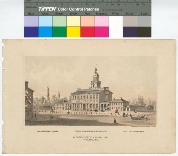 Independence Hall in 1776, Philadelphia. = Unabhängigkeits Halle = Edificio de la Independencia en 1776 = Hotel de L'Independance. [graphic].