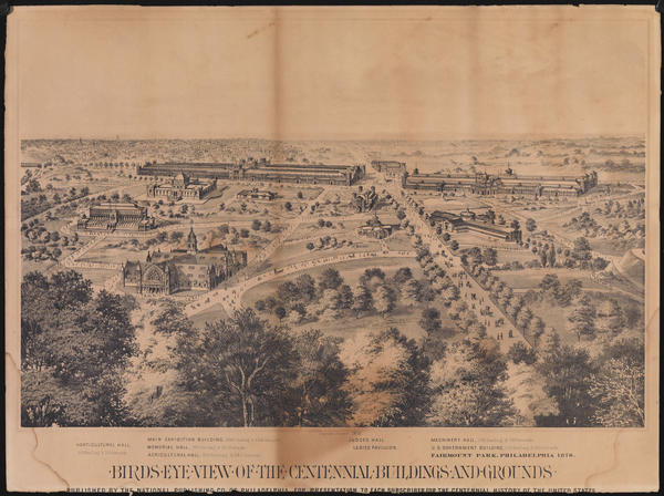 First state of a bird's eye view issued as a promotion by the publisher for "The Illustrated History of the Centennial Exhibition" (1876). View looks south from Belmont Plateau showing the proposed buildings on the exhibition grounds in West Fairmount Park. Includes Horticultural Hall, Main Exhibition Building, Memorial Hall, Agricultural Hall, Judges Hall, Ladies Pavilion, Machinery Hall, and U.S. Government Building. The grounds are lined with trees, bushes, and landscaped paths. Includes several fair visitors traveling by foot and carriage on the paths. Clusters of tree tops are visible in the foreground. Also contains the names and dimensions of the main buildings printed below the image. The Centennial Exhibition celebrated the anniversary of the United States through an international exhibition of industry, agriculture, and art.