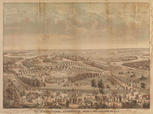 Allegorical commemorative print celebrating the internationalism and historic significance of the Centennial Exhibition. Depicts a bird's-eye view of the active exhibition grounds including the Agricultural Building, Horticultural Building, Main Building, and Machinery Hall. In the foreground, figures representing various races, ethnicities, and cultures convene and interact with one another. An African American woman and man sit on a bench. An African American man, attired in a black suit, tips his top hat and greets a white woman sitting on a bench. Groups of people stand in clusters to converse and walk including Native Americans, attired in feather headdresses, and Chinese women and men. Middle Eastern and Russian men ride on horseback. Contains ghost-like imagery visible in the sky depicting significant historic American moments, figures, and buildings, including William Penn's Treaty with the Indians, George Washington, and the White House. Contains the names of the prominent exhibition halls below the image.