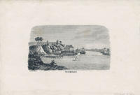 View looking south from the east bank of the Schuylkill River showing the Fairmount Water Works built 1812-1822 after the designs of Frederick Graff. Shows the engine house; mill house; and the pavilions on the mound dam and on Reservoir Hill. Also shows the Wire Suspension Bridge at Fairmount in the far right background.