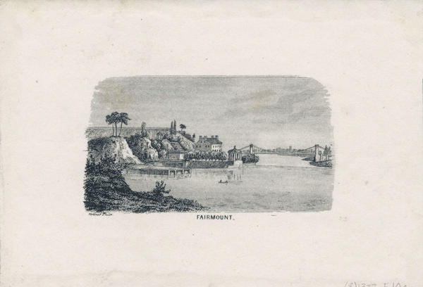 View looking south from the east bank of the Schuylkill River showing the Fairmount Water Works built 1812-1822 after the designs of Frederick Graff. Shows the engine house; mill house; and the pavilions on the mound dam and on Reservoir Hill. Also shows the Wire Suspension Bridge at Fairmount in the far right background.