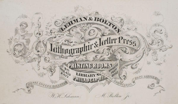 Tradecard illustrated with scrolls, filigree, a banner and a cherub drawing on a pad. William H. Lehman & Mahlon Bolton Jr., purchased the print shop of Jacob Haehnlen in 1873 and remained at the site until 1882 when the business relocated, following a fire, to 715 Arch Street. The firm was active until 1920.