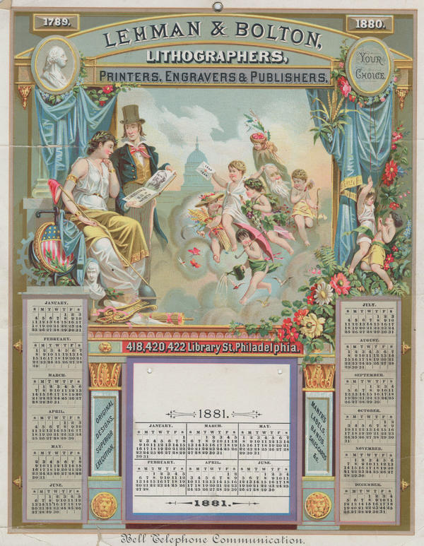 Advertising calendar for 1881 for Lehman & Bolton, a partnership between William H. Lehman and Mahlon Bolton, Jr. formed in 1871. Surrounded by a gilt border, the image shows an ornate setting containing patriotic allegorical figures and symbols, including Liberty with a lyre, marble bust, fasces, and an American shield at her feet sitting with the liberty pole draped across her lap and a laurel wreath on her head as she looks at an album of U.S. Presidents; flowers and cherubs holding grain, holly, a scythe, an umbrella, a watering pot, and other spring symbols; and the dome of the United States Capitol in the background. Text describes various kinds of job printing undertaken by the firm.
