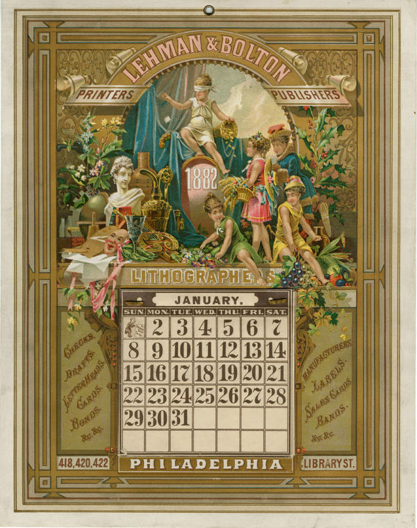 Advertising calendar for 1882 for Lehman & Bolton, a partnership between William H. Lehman and Mahlon Bolton, Jr. formed in 1871. Surrounded by a gilt border, the image shows an ornate stage setting containing classical figures and symbols of the arts, spring, and prosperity, including children surrounded by flowers, fruit, gold coins, a lyre, a marble bust, a tragedy mask, and an art palette. Text describes various kinds of job printing undertaken by the firm.
