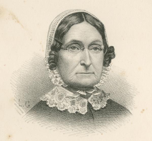 Shoulder-length portrait of the writer wearing a bonnet and eyeglasses. |