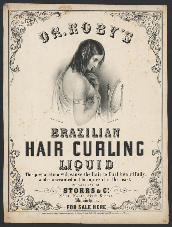Dr. Roby's Brazilian Hair Curling Liquid. This preparation will cause the hair to curl beautifully, and is warranted not to injure it in the least. Prepared only by Storrs & Co. No. 21, North Sixth Street Philadelphia. For sale here. [graphic].