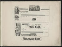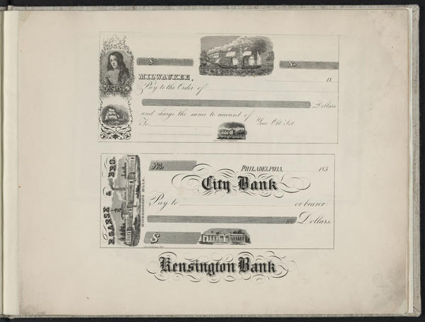Catalog containing specimens, including one plate of vignettes and one plate of banknotes. Vignettes depict "Wingohocking Mills, Frankford, Pa."; "Crane Iron Company"; and the landscape view "Broad Top." Banknotes include vignettes showing the entire complex and a specific building at "R. Garsed & Bro. Wingohocking Mills"; a locomotive; and a sailing ship. Banknote plate also includes a sample of lettering reading "Kensington Bank." Catalog also contains a double-sided page of variant specimen lettering presented as text advertising Kollner to "Druggists, Chemists, Manufacturers and Publishers of Books, Periodicals, Maps, &c." Text promotes his samples of work including, "tasteful labels, showcards, ornamental borders title pages,and business & visiting cards, in handsome of lettering" in addition to his views for Goupil, Vibert & Co and "Large Map of of the City of New York now publishing" (i.e., Dripps map, 1851).Text also promotes transfers from steel and copper plates, and "indefinite number of copies can be struck off at short notice and at very moderate charges."