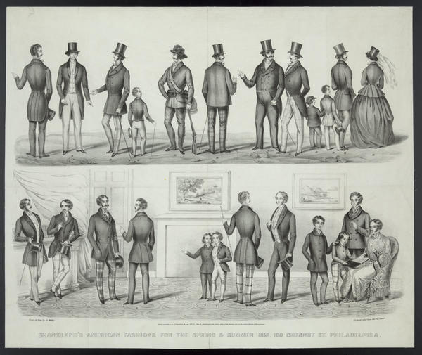 setting with eight men, three boys, and a woman. Most of the men, including a portly gentleman, wear long coats, top hats,