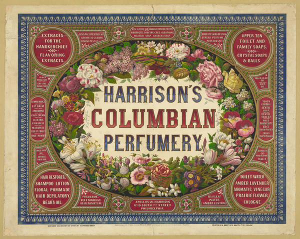 Advertisement for the Philadelphia perfumer and ink manufacturer containing a wreath of multiple types of flowers encased by a border of geometric shapes listing dozens of Harrison's products. Products include flavoring extracts, scented soaps, toiletries, skin creams, oils, and perfumes. Also contains miniature jewel-like ornamental details and an outer frame-like border. Harrison began operating his perfumery circa 1853 and by the late 1850s employed over 80 employees, including 25 traveling agents.