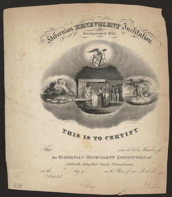 Certificate for the Pottsville, Schuylkill County, Penny branch of the benevolent society. Contains four vignettes showing the Pennsylvania state seal design; an eagle holding a harp adorned in vinery; a scene including a tree surrounded by symbols of the society; and a sick-bed scene captioned "Benevolence" with a woman attending an ill man as two well-attired gentlemen enter the room.