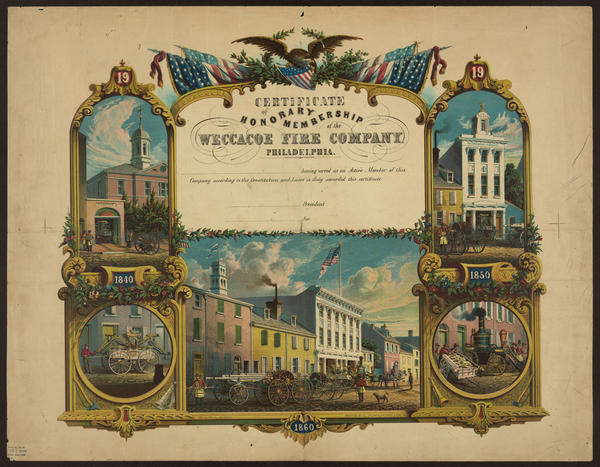 Honorary membership certificate containing vignettes of Weccacoe Fire Company engine houses and firefighting equipment between 1840 and 1860 within a decorative border adorned with filigree, bugles, and axes. American flags, laurel wreaths, and an eagle with a shield surmounts the text in the central portion of the certificate, below which is an 1860 view of the fire company’s engine house on the 100 block of Queen Street in Southwark. Fire fighters and wagons loaded with equipment congest the street in the foreground. A large American flag flies atop the roof of the engine house. Left and right panels contain smaller views of the 1840 firehouse and its hand-pumper fire engine and the three-story, enlarged engine house and a steam fire engine from 1850. All scenes include fire fighters dressed in the red and blue Weccacoe uniform.