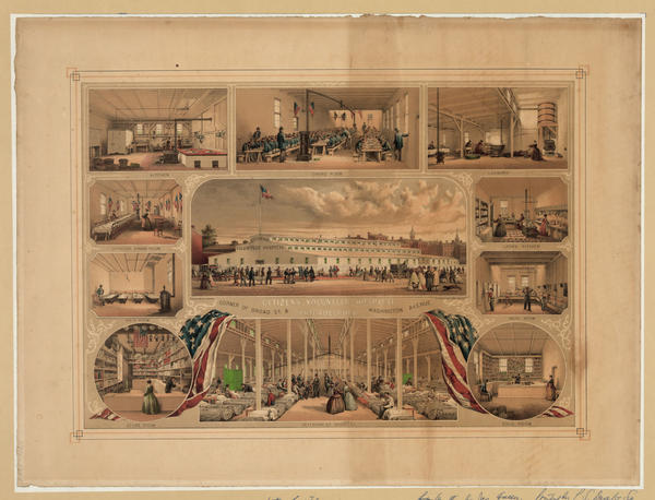 Print containing a montage of 11 exterior and interior views of the volunteer hospital opened September 5, 1862 opposite the Philadelphia, Wilmington, and Baltimore Railroad depot. Central view shows a bustling street scene outside of the hospital. Horse-drawn carriages, possibly including an ambulance, arrive and depart; injured soldiers are carried by stretcher and assisted by fellow soldiers to the building; male and female pedestrians converse and traverse the streets; two boys attempt to help a man with his valise; and Zouaves patronize a female vendor's stand. Other views show the "Interior of Hospital" where women volunteers and doctors attend to bed-ridden soldiers; the "Kitchen" equipped with an ice box, cooking stove, and heating stove where two women prepare food on a counter; the "Dining Room" in which several soldiers eat at three long rows of tables near a heating stove; the "Laundry" room where women sort, fold, and wash cloths in a sink, near a large vat of boiling water; the "Ladies Kitchen" containing cupboards of dishware, a small cooking stove, and a rack of cooking utensils in which three women work; the "Wash Room" in which four men wash up at a trough of sinks; the "Drug Room" in which a pharmacist distills drugs for a soldier and women volunteer in front of a wall of medicinal bottles; a female volunteer at the counter of the "Store Room" attended by a man surrounded by several shelves packed with supplies; the "Bath Room" lined with tubs in which a soldier begins to undress; and female volunteers setting tables in the "Officers Dining Room."