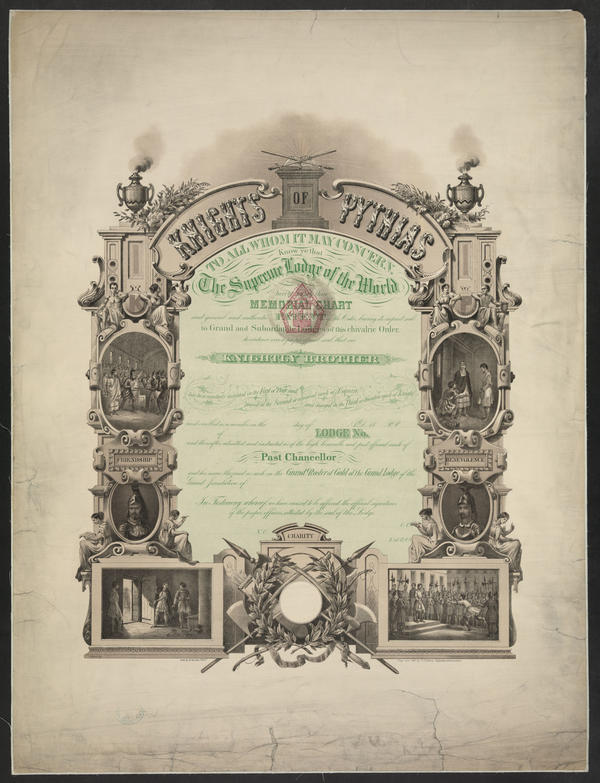 Membership certificate containing vignettes of scenes representing the tenets of the order (i.e., friendship, benevolence, and charity) composed within a border designed as a monument. Scenes include figures attired in Roman costume during acts of intervention from persecution and imprisonment. Also contains bust-length portraits of Roman soldiers, allegorical female figures, and emblems of the order, including a sword laid on an open Bible; crossed swords; a sprig of myrtle; and spikes. Knight of Pythias was an international, non sectarian, fraternal order established in 1864 on the principles of "toleration in religion, obedience to law, and loyalty to government."