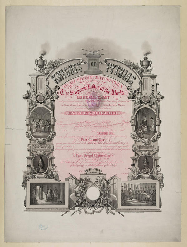 Membership certificate containing vignettes of scenes representing the tenets of the order (i.e., friendship, benevolence, and charity) composed within a border designed as a monument. Scenes include figures attired in Roman costume during acts of intervention from persecution and imprisonment. Also contains bust-length portraits of Roman soldiers, allegorical female figures, and emblems of the order, including a sword laid on an open Bible; crossed swords; a sprig of myrtle; and spikes. Knight of Pythias was an international, non sectarian, fraternal order established in 1864 on the principles of "toleration in religion, obedience to law, and loyalty to government."