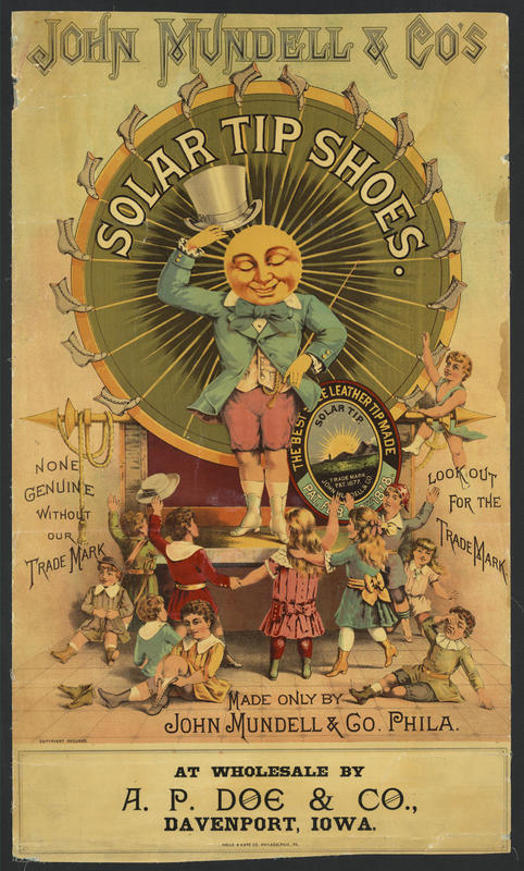 John Mundell & Co.'s Solar Tip Shoes. Made only by John Mundell & Co. Phila. [graphic] : None genuine without our trademark. Look out for the trademark. At wholesale by A.P. Doe & Co., Davenport, Iowa.
