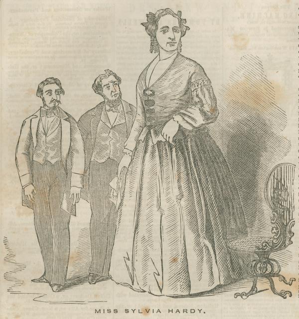 Full-length portrait of Miss Hardy standing beside two unnamed men, perhaps as a means of depicting her extraordinary height. |