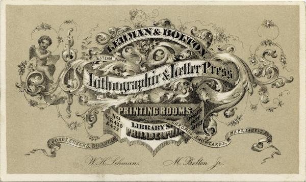 Lehman & Bolton steam power lithograph & letter press printing rooms. Nos. 418, 420 & 422 Library Street, Philadelphia. Opposite Post Office. [graphic] : Bonds, checks, bill heads, chromos, showcards, maps, labels, &c.
