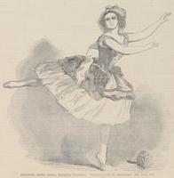 Full-length portrait of Miss Rolla dancing on stage, with a bouquet at her feet. |