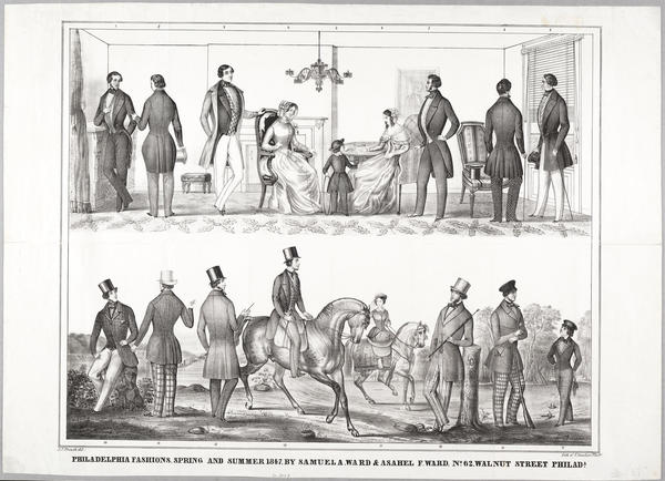 Fashion advertisement containing two panelled scenes of 17 elegantly attired men, women, and children in a parlor setting and an outdoor hunting scene. Upper panel shows a parlor furnished with floral carpet, a fireplace, an ornate chandelier, window blinds, a portrait painting, and high-backed chairs. At the center of the scene a young boy with a hoop entertains two seated women attired in dresses and bonnets. Six men dressed in solid or plaid pants, jackets, vests, cravats, and top hats flank the women and child in the center and converse with one another. Lower panel shows six figures, some standing, some leaning against tree stumps, and a man and a woman mounted on horses in the center of the scene. The male figures, including one boy, are attired in solid or plaid jackets, plaid pants, vests, and top hats. One man holds a rifle and faces the boy (right) who holds what appears to be a dead bird behind his back, as another dead bird rests on the ground at his feet. The woman, sitting sidesaddle, wears a dress, jacket, gloves and a plumed hat. Many of the depicted men, in both scenes, have mustaches and or sideburns. Figures numbered 1-17.