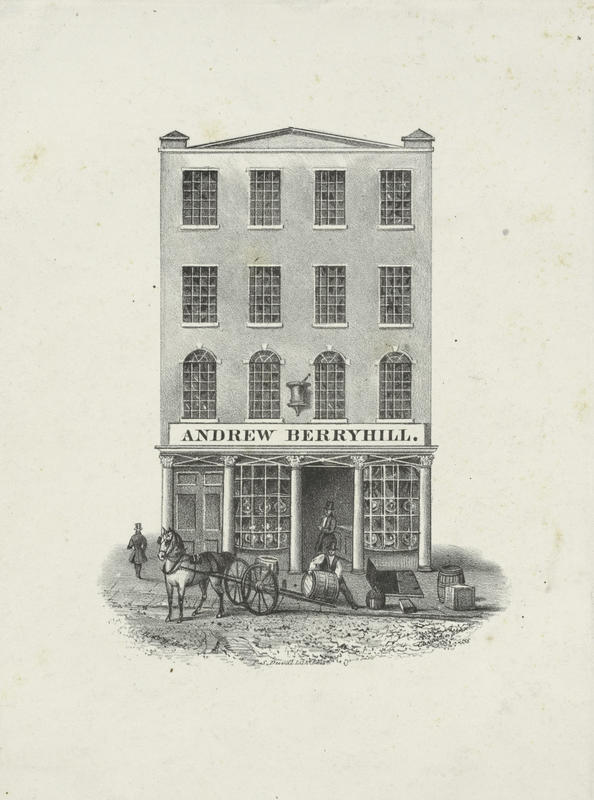 Advertisement proof showing the four-story establishment for Andrew Berrybill at 25 South Eighth Street adorned by a large mortar and pestle and a signboard that reads "Andrew Berryhill." The drugstore's display windows on the first floor are flanked by columns. A gentleman stands in the doorway as a laborer loads a barrel onto a horse-drawn dray in the foreground. Barrels and crates pulled from the cellar sit on the sidewalk. Andrew Berrybill tenanted this property from 1839-1840.