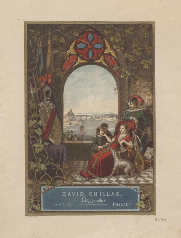 Advertisement for lithographer David Chillas active ca. 1852-1858 depicting a Gothic-inspired castle scene. Shows a lady seated in front of a large Gothic-style ornamented window overlooking the ocean. Two boys, a man, and dog surround her. A lyre rests next to her chaise lounge and a suit of armorand flags are displayed on a table across from her. Vinery borders and filters into the scene.