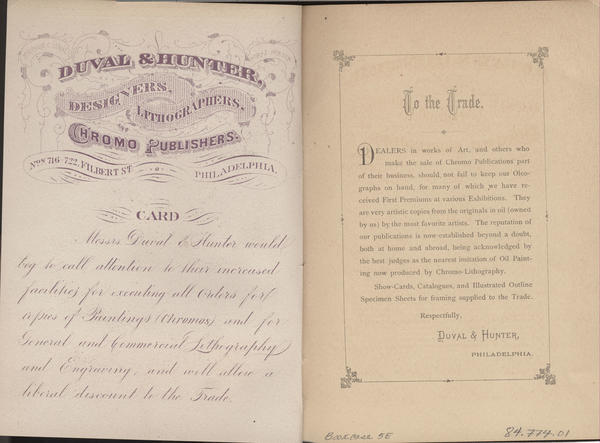 Also includes two specimen pages of script for "Duval & Hunter, Designer, Lithographers, and Chromo Publishers, Nos. 716-722 Filbert St. Philadelphia" that promote the services and prints supplied by the establishment, including "a liberal discount to the trade," "check books," "labels of all kinds," and "Portraits and Lithography in all its Branches." Catalog also contains preface "To the Trade" and title list with prices.