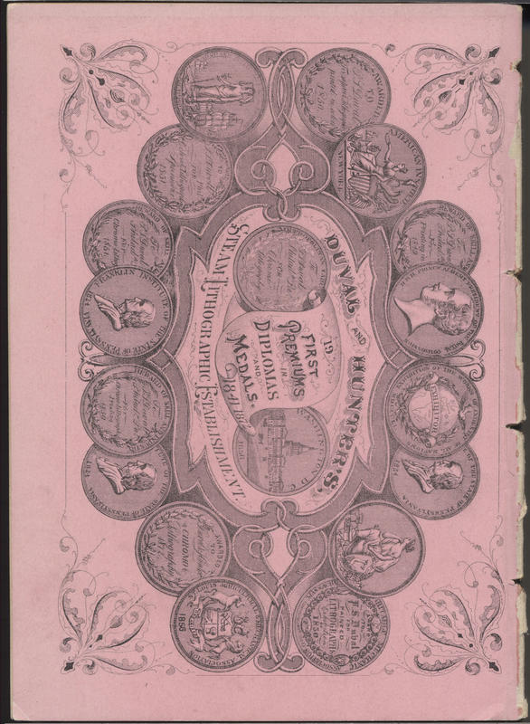 Trade catalog containing an ornate front and back cover and two specimen pages of script promoting Thomas Hunter, former partner in Hunter & Duval (active 1869-1874). Front cover contains central vignette showing a woman with two cherubic figures seated on filigree. The woman writes on a lithographic stone and the figures hold a banner reading "Duval & Hunter" and a printing ink roller. Rear cover contains a wreath of medals awarded to predecessor firms P. S. Duval and Duval & Hunter. Medals, many from the Franklin Institute, enclose text reading "Duval and Hunter's Steam Lithographic Establishment. 19 First Premiums in Diplomas and Medals. 1841-1872" and contain inscriptions, dates, allegorical figures, seals, and busts of Benjamin Franklin and King Albert. Several of the medals reference color lithography and chromolithography.