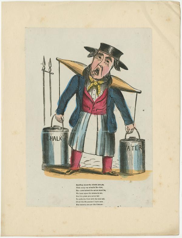 Text: Bawling about the streets you go, / With noisy cry of milk Be—low, / BE-LOW indeed the MILK must be, / We none upon the SURFACE see, / For it is plain you never fail / To milk the cow with the iron tail. / Of all the MILKMEN I have seen, / Of roguery you are the CREAM.
