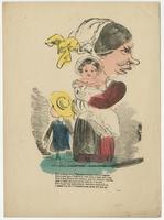 A woman with a grotesquely large nose holds a baby and is accompanied by a small boy. The text suggests that since her large nose and head repel any possible suitors, she must content herself with caring for these children.