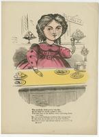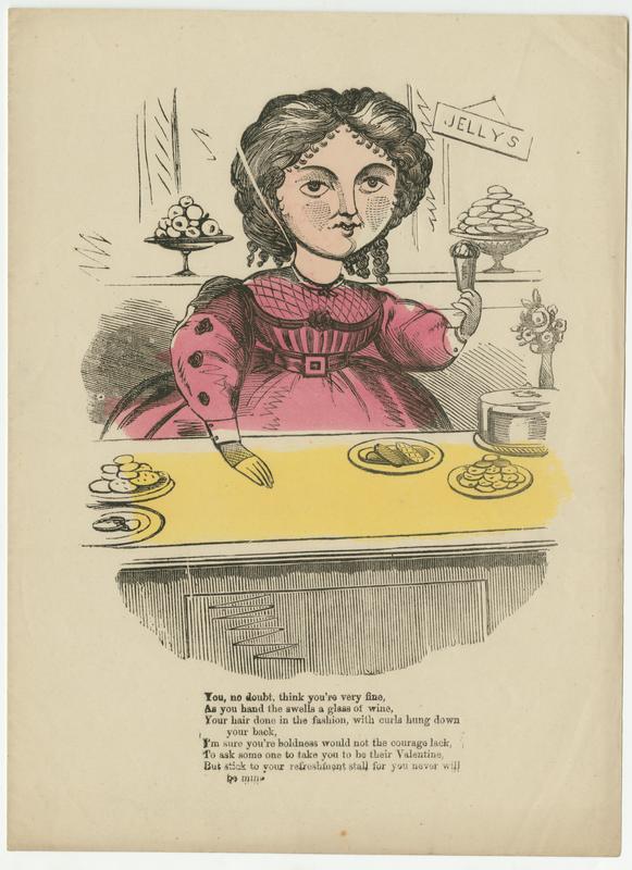 Text: You, no doubt, think you're very fine, / As you hand the swells a glass of wine, / Your hair done in the fashion, with curls hung down your back, / I'm sure you're boldness would not the courage lack, / To ask some one to take you to be their Valentine, / But stick to your refreshment stall for you never will be mine.
