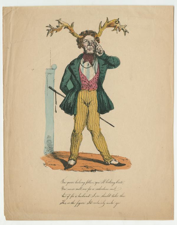 Text: You queer looking fellow, you ill looking brute, / You never will me for a valentine suit, / And if for a husband I ever should take thee / This is the figure I'd certainly make ye.
