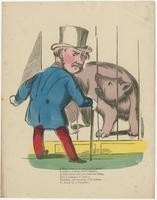 A man in a coat and top hat and bear are separated by bars. The man's head is turned away from the bear and the bear is looking at the man. The text characterizes the man as having dangerous animal qualities, and the placement of the two figures poses the question of who is really the beast in a cage.