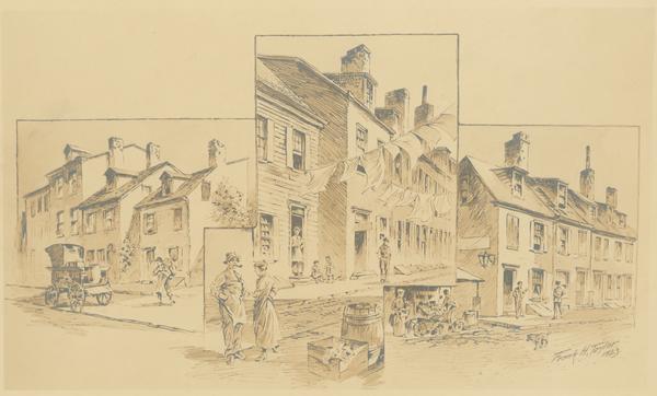 street. The middle panel depicts people talking in the street with laundry lines overhead. Finally, the right panel shows