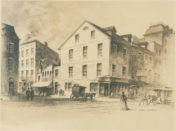 Cobblestone street view of the corner of Sansom and Sixth streets. Shows residential buildings as well as pedestrianas and horse-drawn carriages.