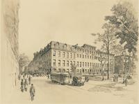 Street view of the corner of Sixth and Walnut Streets. Pedestrians, a trolley, and an early automobile populate the street, while the corner building reads, "Union Casualty Insurance Company."