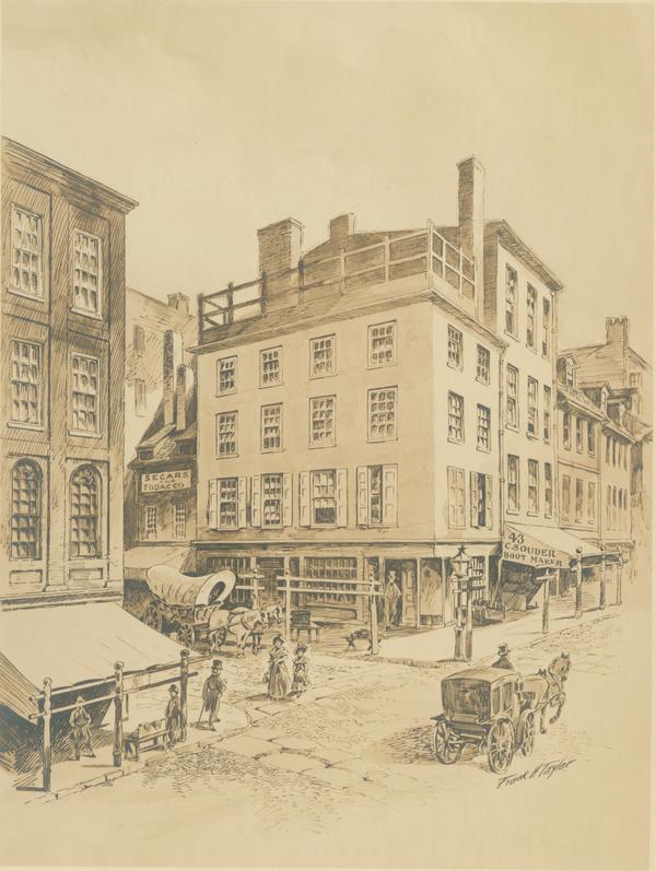 The story of every old landmark round about Second and Chestnut Streets should antedate the Revolution. The original structure at the northeast corner was very time worn when Billy Wigglesworth had his toy store there in 1790. Since then this and the adjoining property have been repeatedly built over. This corner was always a poptular center of the boot-making industry. Here was gathered, in long-ago times, a variety of retailers, profiting by location at the intersection of the city's two busiest highways. The drawing herewith portrays the buildings as seen in 1857. The Corn Exchange Bank had its first home here, and the successor of that institution, the Corn Exchange National Bank, occupies the handsome modern building which covers the same site.