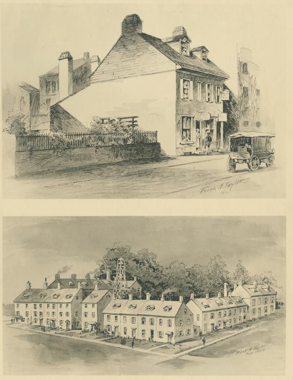 The two neatly-kept little dwellings in Juniper Street, north from Locust Street and in the rear of the Philadelphia Library, are surviving reminders of "the village," an early suburban settlement, mainly of wooden construction, which once covered this square, and which included a tavern, at the corner of Broad and Locust Streets, and a police station adjoining, behind which a fire-bell tower rose above the trees. The general view of the village has been made from a small but interesting contemporary sketch painted by the father of Mr. Newman F. McGirr, the book dealer. It may be seen at the above named library.
