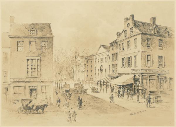 This drawing portrays the appearance of Ninth Street prior to 1874 when the old college buildings, vacated by the University of Pennsylvania two years before, were removed and work on the present Federal building was commenced. In the early days of the Republic (1798) the State of Pennsylvania caused the erection, on this site, of a spacious residence for the President, but it was not so occupied. The structure was replaced in 1829 by the U. of P. The Gimbel store now includes the site of Cooper & Conard store at the left.