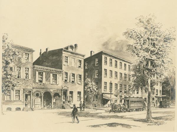 These structures, orignially built for residential purposes, housed, in later times, many noted attorneys. The Loganian Library was established upon the site in 1790, in which was deposited the valuable collection of rare books bequeathed to the Library Company of Philadelphia by Chief Justice James Logan, of Stenton. The small street extending northward to George or Sansom Street, was named in honor of George Swanwick, who bought the tract from the Gilpin and Fisher families in 1794. The small arched structure in the drawing gave access to the Ludwich Institute, and beneficence for the education of the boys established by Christopher Ludwich, a German cake baker, of Letitia Street, a friend of Washington and baker-general of the Revolutionary Army. It is worthy of mention that one of the journeymen employed in Ludwick's bakery was Frederick Fraley. Ludwick's home was in Germantown. He gave much of his savings to the Revolutionary cause. His legacy of $8000.00 was carefully fostered by the trustees, and some part of it is still administered. All of these buildings, as well as the substantial residences to the westward, in the same block, among them the homes of three of our mayors, were razed to be replaced by the great structure of the Curtis Publishing Company.