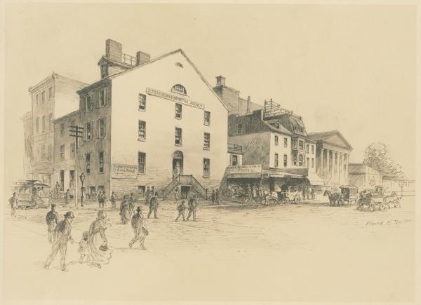 Not so long ago the space upon which the Real Estate Trust Building and the North American Building now rise held the structures here portrayed. At the corner of Chestnut and Broad streets there yet remained the large mansion wherein Harmer served good dinners to particular people, where the Pennsylvania Railroad Company sold tickets and where Benjamin Franklin (not the philospher, mind you!) kept his sleuths when they were not on the track of evil-doers. Just below, on neighborly terms with other residences. Hallowell & Son sold choice fruits, and, at the corner of George street, the old Independent Church still recalled the eloquence of Dr. Chambers.