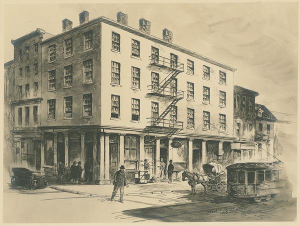 The earliest structure at this corner was a two-story frame building, which was respectable aged when, in the year 1790, it was occupied as a "department store" by Joseph and Jesse Sharpless, who also manufactured boots and shoes. Five years late the latter merchant had built a four-story brick building on Second street, just above the corner, which the contemporary wiseacres promptly dubbed "Jesse's folly." A drawing made in 1829 indicates that the old Sharpless store was then occupied by "Russell's hat shop." Another four-story structure was erected on the corner in 1833. This still remains. In 1839 the publishing office of the "Spirit of the Times" was located here, under the management of John S. Du Solle. L. Pelouze established a type foundry on the upper floor in 1848. A notable tenant was Volney B. Palmer, the pioneer advertising agent of America, who was located here ten years from 1846.