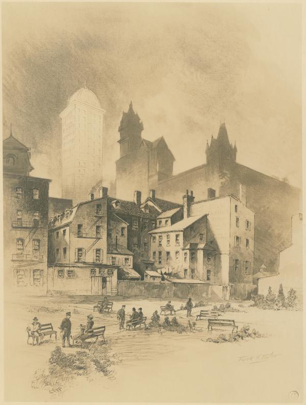 The foreground of this vista, sketched from a window of the U.G.I. building, was once covered by the Arch Street Prison. In later days there stood here the Lutheran Church of the Holy Communion, razed some years ago. The picturesque huddle of rear-buildings, in process of removal in the spring of 1917, reveal all that was then left of the former dignified homes of families once of businesses and social prominence, but which the present generation will recall only as an unregretted succession of saloons, restaurants and shops more bizarre than attractive.