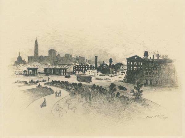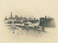 Panoramic view of the Ben Franklin Parkway in 1917. Factories can be seen in the middle ground and buildings in Center City in the background, including a silhouette of City Hall on the left side of the drawing.