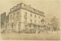 Depicts a four-story upscale residence on the corner of Eleventh and Chestnut Streets, identified as having been owned by
