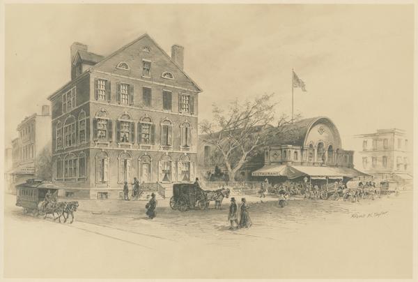 Depicts a three-story brick residence on the corner of Eleventh and Chestnut Streets. Adjacent is a busy market building with people and horse-drawn carriages in front.